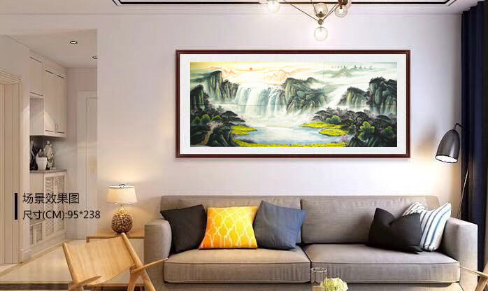 第一字画网的客厅山水画,小八尺山水画若裱完后尺寸近2.8米左右,是一幅挺有意境的小八尺山水作品,作品清新秀雅,布局合理,这幅作品视觉效果上佳,如果放在画廊出售,林云老师此幅小八尺山水画的标价在5000元左右。